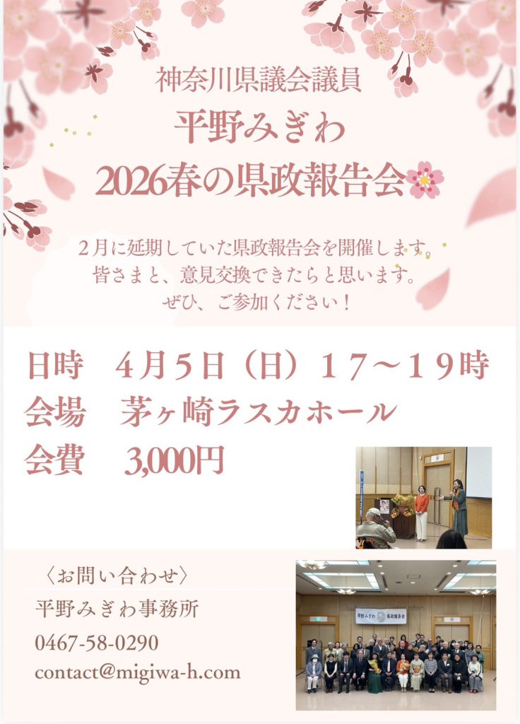 延期にしていた県政報告会を再調整しました!県議会報告、これからのこと等、意見交換させていただけたらと思います。是非、お越しください!